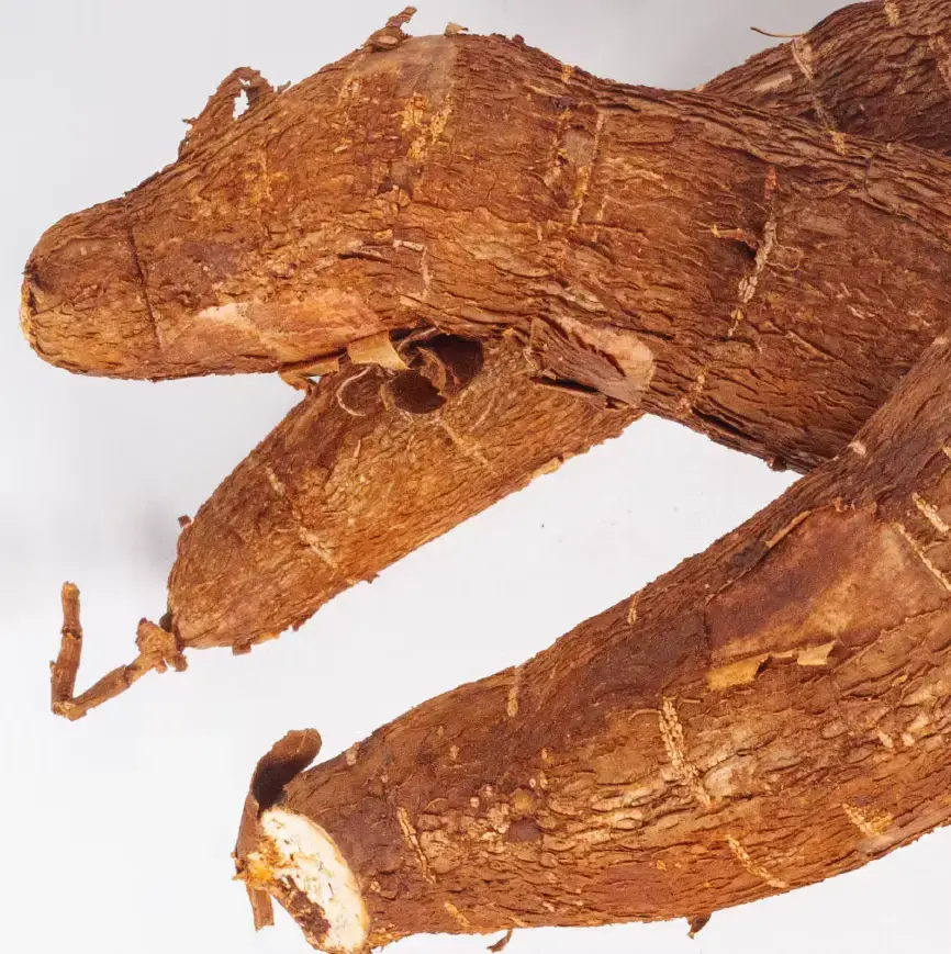 La yuca es un tubérculo de raíz cilíndrica y alargada, que puede alcanzar hasta 40 cm de largo y 15 cm de diámetro. Su piel es de color café oscuro, lo que le da un aspecto rústico y terroso; en contraste, su interior va de blanco a beige claro.